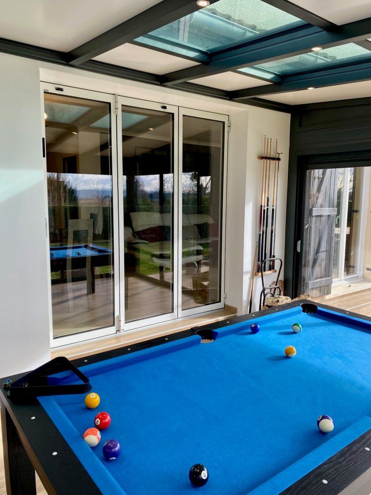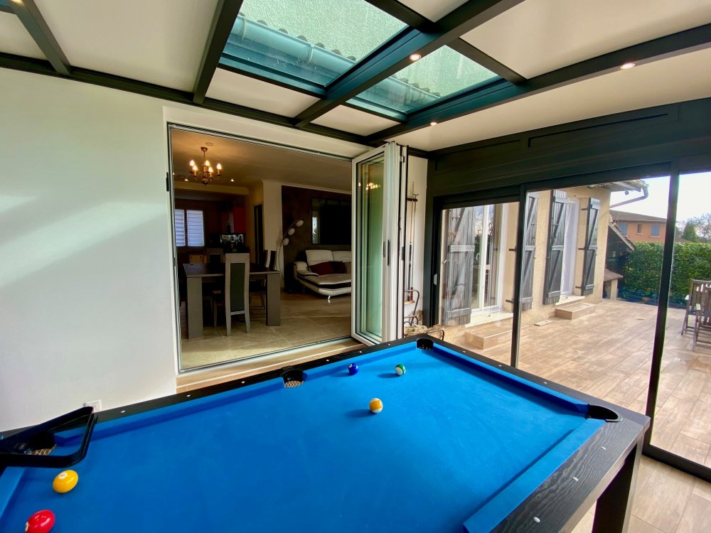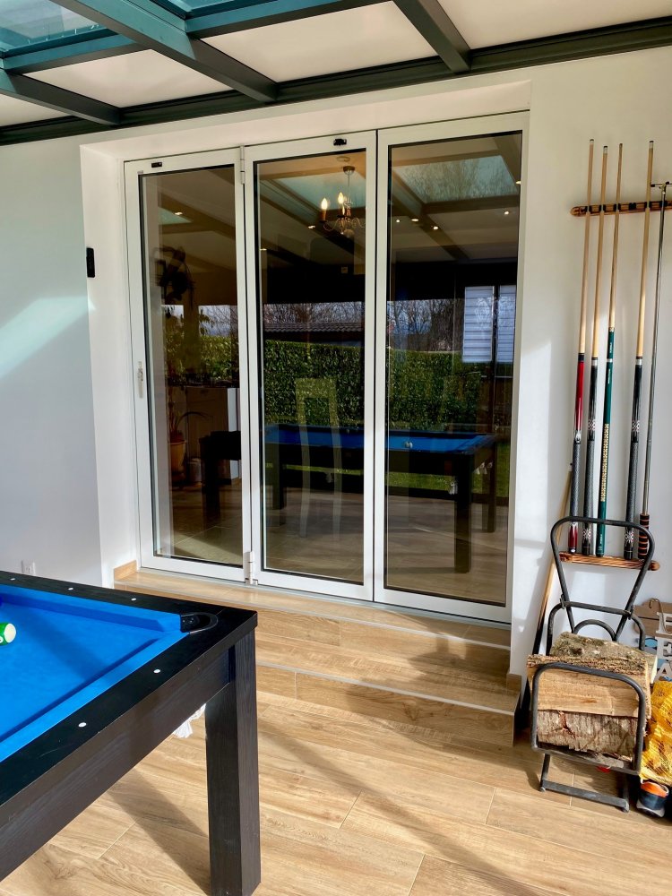 Nouveauté dans l'Ain (01) : Remplacement d’une baie coulissante par une baie accordéon sur-mesure pour une ouverture totale sur la véranda..