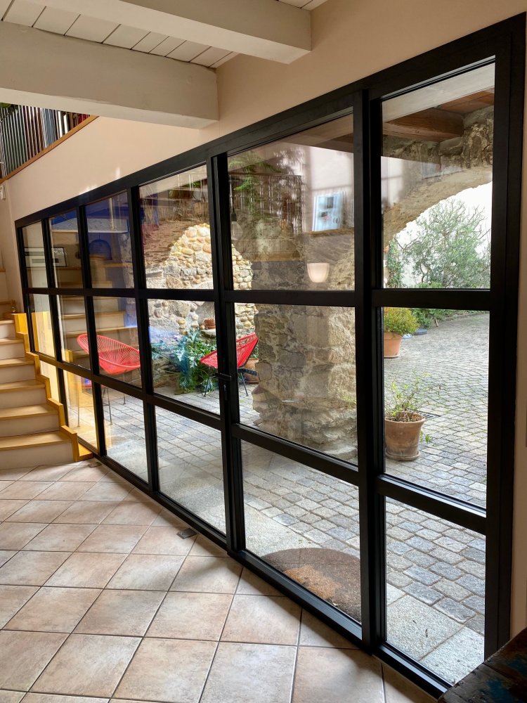Installation d’un ensemble verrière sur-mesure avec châssis fixe, porte, et porte-fenêtre.