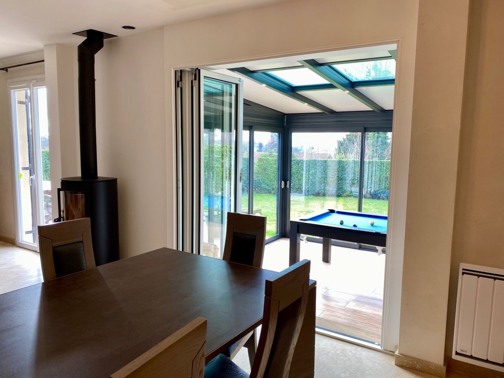 Remplacement d’une baie coulissante par une baie accordéon sur-mesure pour une ouverture totale sur la véranda près de Trévoux (01)