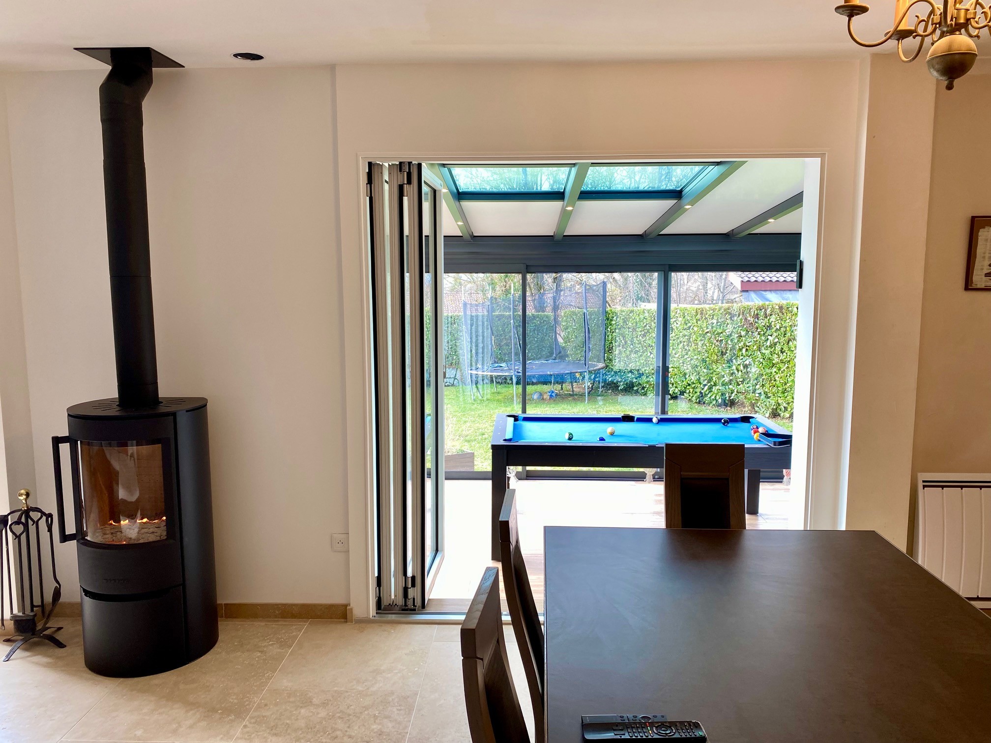 Dans ce projet, la baie coulissante existante a laissé place à une baie accordéon sur-mesure, apportant une transformation nette et assumée de la véranda.